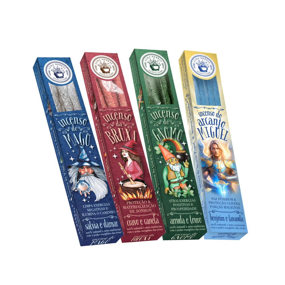 Contém 20 caixas (5 aromas de cada: Bruxa, Mago, Gnomo e Arcanjo Miguel)