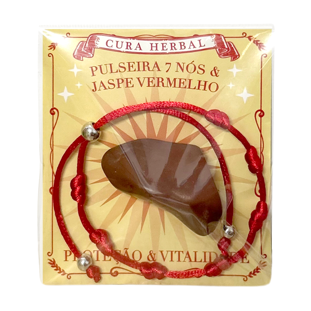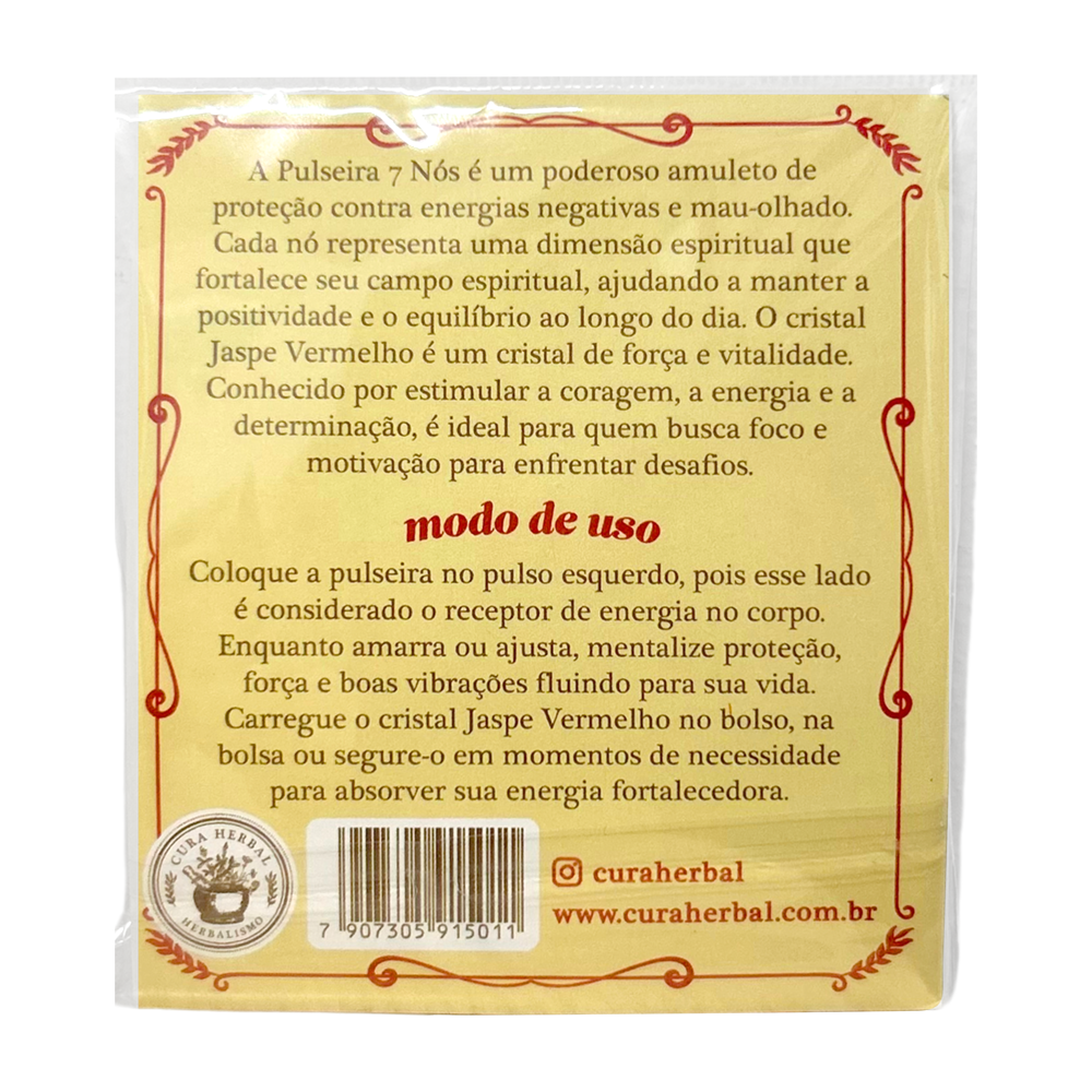 A pulseira 7 Nós é um poderoso amuleto de proteção contra mau-olhado. Cada nó representa uma dimensão espiritual que fortalece seu campo espiritual, ajudando a manter a positividade e o equilíbrio ao longo do dia. O cristal Jaspe Vermelho é um cristal de força e vitalidade. Conhecido por estimular a coragem, a energia e a determinação, é ideal para quem busca foco e motivação para enfrentar desafios.