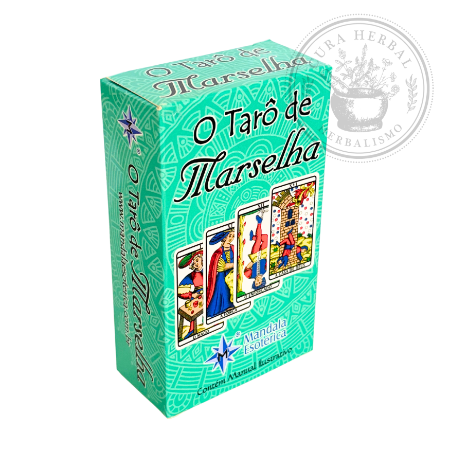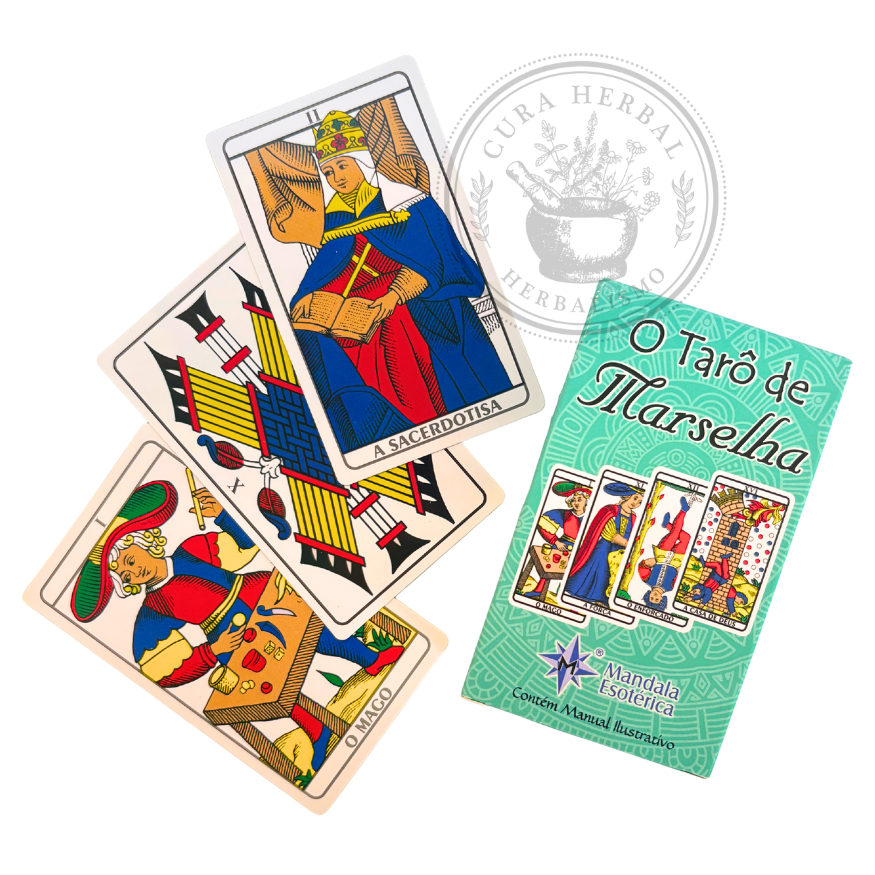 Baralho com 78 cartas coloridas e plastificadas do tarô de Marselha e com um guia explicativo de 30 páginas sobre como jogar o tarô.