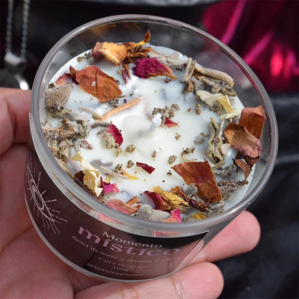 Vela Aromática feita artesanalmente para favorecer a magia, intuição e conexão com o Sagrado Feminino. Com notas florais e adocicadas.